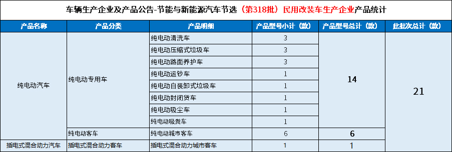 共计17个生产厂家、17个品牌、21个型号进入第318批节能与新能源汽车节选范畴,民用改装车生产企业新产品类型明细如下表所示。