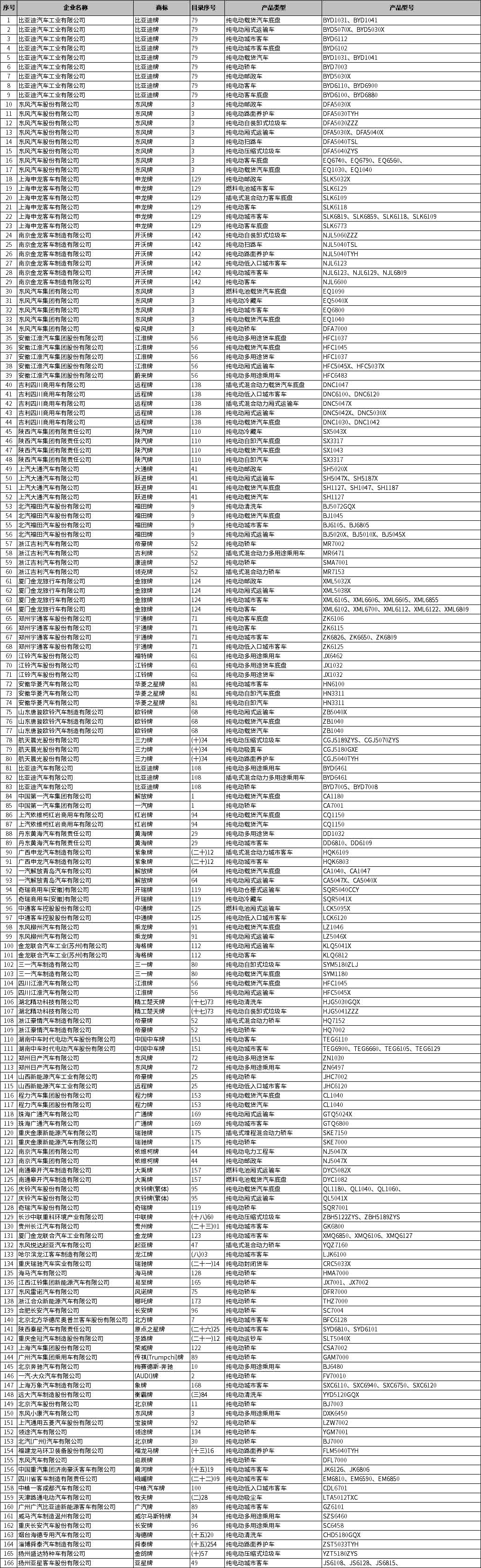 2、燃料种类:本批次纯电动产品共计151款(含乘用车31款;客车35款;专用车59款;底盘26款);插电式混合动力产品10款(含乘用车6款;客车1款;专用车1款;底盘2款);燃料电池产品5款(含客车1款;专用车2款;底盘2款)。