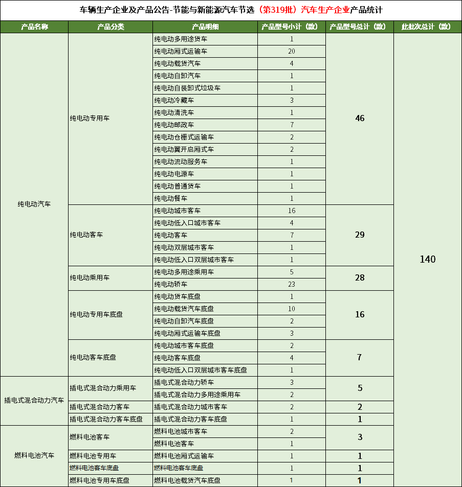 共计60个生产厂家、59个品牌、140个型号进入第319批节能与新能源汽车节选范畴,汽车生产企业新产品类型明细如下表所示。