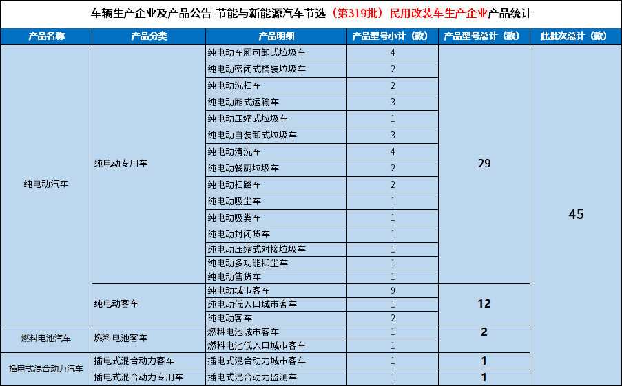 共计28个生产厂家、28个品牌、45个型号进入第319批节能与新能源汽车节选范畴,民用改装车生产企业新产品类型明细如下表所示。