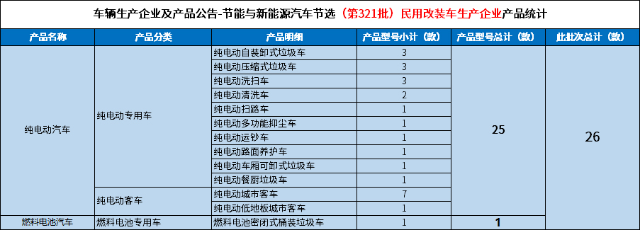 共计15个生产厂家、15个品牌、26个型号进入第321批节能与新能源汽车节选范畴,民用改装车生产企业新产品类型明细如下表所示。