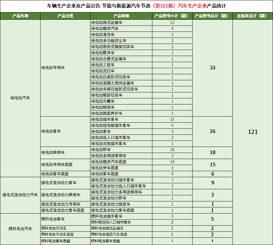 共计52个生产厂家、45个品牌、121个型号进入第321批节能与新能源汽车节选范畴,汽车生产企业新产品类型明细如下表所示。