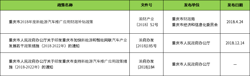 政策支持:节能与新能源汽车扶持政策3个,《重庆市2018年度新能源汽车推广应用财政补贴政策》、《重庆市人民政府办公厅关于印发重庆市加快新能源和智能网联汽车产业发展若干政策措施(2018 2022年)的通知》、《重庆市人民政府办公厅关于印发重庆市支持新能源汽车推广应用政策措施(2018-2022年)的通知》