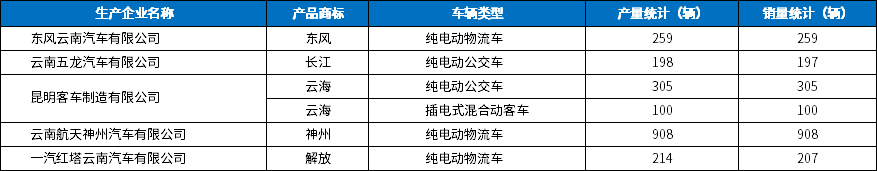 2018年,云南航天神州汽车有限公司生产销售新能源汽车908辆,昆明客车制造有限公司生产销售新能源汽车406辆,东风云南汽车有限公司生产销售新能源汽车259辆,一汽红塔云南汽车有限公司生产和销售新能源汽车214辆和207辆,云南五龙汽车有限公司生产和销售新能源汽车198辆和197辆。
