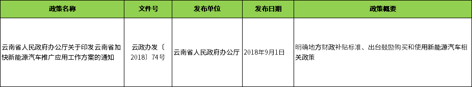 政策扶持:节能与新能源汽车年鉴政策扶持政策1个,《云南省人民政府办公厅关于印发云南省加快新能源汽车推广应用工作方案的通知》