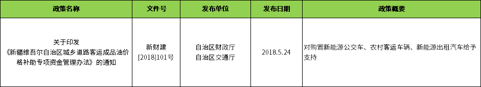 政策扶持:节能与新能源汽车扶持政策1个,关于印发《新疆维吾尔自治区城乡道路客运成品油价格补助专项资金管理办法》的通知