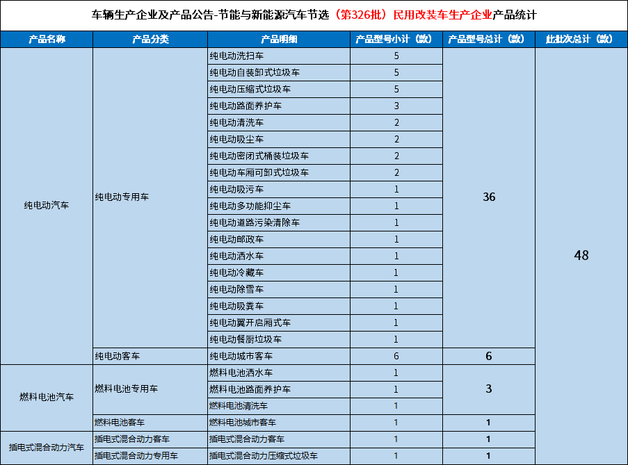 共计33个生产厂家、32个品牌、48个型号进入第326批节能与新能源汽车节选范畴,民用改装车生产企业新产品类型明细如下表所示。