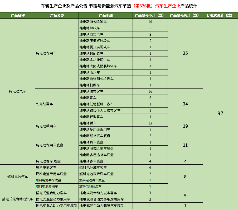 共计56个生产厂家、52个品牌、97个型号进入第326批节能与新能源汽车节选范畴,汽车生产企业新产品类型明细如下表所示。
