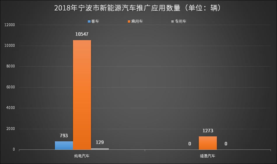 2018年,宁波市推广应用新能源汽车12742辆,折合标准车21529.5辆。其中,纯电动客车793辆,纯电动专用车辆129,纯电动乘用车10547辆,插电式混合动力乘用车1273辆。