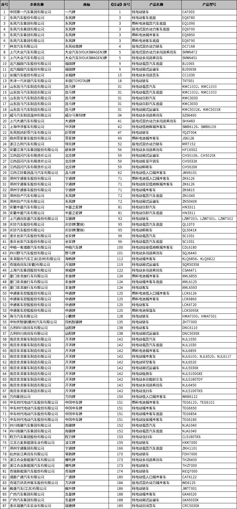 2、燃料种类:本批次纯电动产品共计98款(含乘用车18款;客车20款;专用车47款;客车底盘3款;专用车底盘10款);插电式混合动力产品6款(含乘用车4款;客车1款;客车底盘1款);燃料电池产品11款(含客车8款;专用车1款;客车底盘1款;专用车底盘1款)。