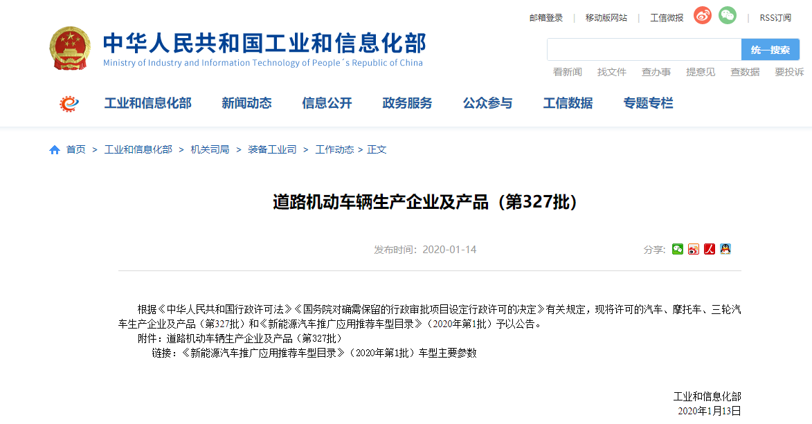 2020年1月14日,工业和信息化部公告了《道路机动车辆生产企业及产品(第327批)》,依据同一型号判定原则归纳后,通过技术审查的新能源汽车产品共计115个。