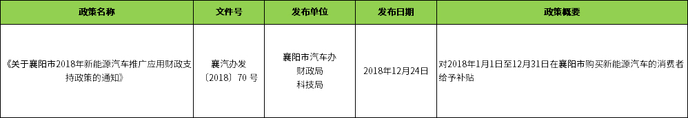 政策扶持:节能与新能源汽车扶持政策1个,《关于襄阳市2018年新能源汽车推广应用财政支持政策的通知》