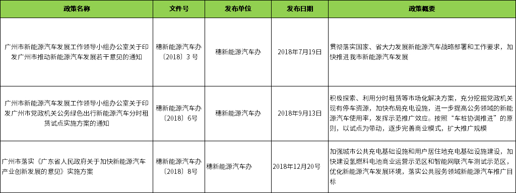 政策扶持:节能与新能源汽车扶持政策3个,《广州市新能源汽车发展工作领导小组办公室关于印发广州市推动新能源汽车发展若干意见的通知》、《广州市新能源汽车发展工作领导小组办公室关于印发广州市党政机关公务绿色出行新能源汽车分时租赁试点实施方案的通知》、广州市落实《广东省人民政府关于加快新能源汽车产业创新发展的意见》实施方案