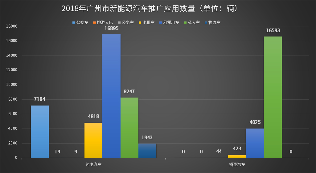 2018年,广州市新增新能源汽车73160辆,保有量达到134041辆,同比增长165%,占全市机动车保有量257.33万辆的5.2%,占全国新能源汽车保有量261万辆的5.1%。其中,公交车11225辆、巡游出租车1396辆、网约车26300辆、环卫车90辆、公务车63辆,货车超过5000辆、私人用车约89000辆。