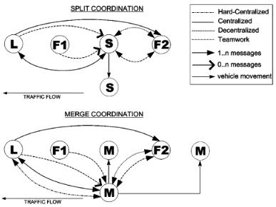 此后,加拿大的Halle等人吸取和借鉴了Tsugawa的成果,提出了车辆协同驾驶系统结构,主要对管理层和控制层进行具体的模块化设计,并针对车队协同驾驶过程中数据采集与处理、车队协同控制、车队通信、策略决策等做了详细的说明。此系统结构都具有较高的实用价值,为车辆协同控制系统提供了很好的参考。