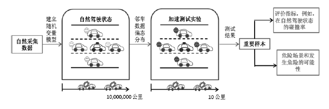 基于提高有效测试场景的加速测试是通过一定的方法提高感兴趣测试场景的出现次数,从而加速自动驾驶汽车在所需测试场景中的表现。例如,在虚拟测试中增大危险场景发生的概率,提高自动驾驶汽车遇到危险场景的频次,从而在相对较少的测试里程中遇到更多的危险场景,从而缩短测试里程并加速测试。