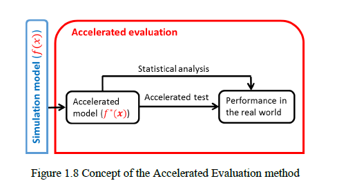 2016年,密歇根大学Ding Zhao对自动驾驶汽车的加速测试进行了探究。该文对过去自动驾驶测试的方法进了总结,并提出了加速测试的6步法和四种加速测试方法:基于可能性分析的的加速测试、基于重要性采样技术的加速测试、自适应加速测试、基于随机优化技术的动态场景加测测试,并且进行仿真测试验证了加速测试方法的有效性。加速测试的方法如图2.1所示。