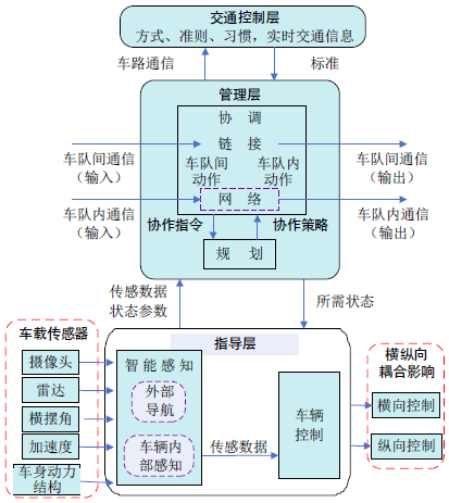 其交通控制层位于路侧,其中,搭建的路侧设备,如可变情报板、标示牌、通信设备等,均用于支持车辆的协同驾驶;制定的基本准则,如规则、规定、行为方式等,均用于指导车辆的协同驾驶。车辆管理层和控制层位于车载端,用于协同驾驶策略的决策与执行。