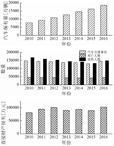 汽车保有量不断增加,交通拥堵问题日益严重,随之产生的环境污染加重问题以及交通时间浪费问题也变得不可忽视;同时,每年的交通事故数量也居高不下,由此也带来了巨大的人民生命财产损失。图1.1为2010年到2016年中华人民共和国国家统计局发布的关于民用汽车保有量、汽车交通事故量、汽车交通事故死亡人数、受伤人数及直接财产损失的统计数据。交通事故和人民生命财产损失常年居高不下,交通安全问题十分严峻。
