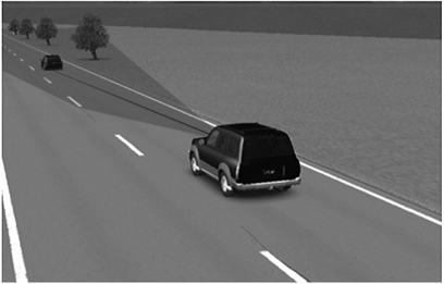 目前的协同式自适应巡航控制器的控制结构仅考虑本车车辆与本车车辆前方的单个车辆或多个车辆之间的间距策略问题。为了避免可能发生的后车车辆与本车车辆的追尾碰撞事件,一种可行的策略是设计变更车道辅助系统,基于此来帮助车辆检测变道环境,环境安全允许下运行变道辅助系统。在实际行驶过程中,驾驶员如果在变更车道过程中稍有不慎,就可能陷入危险,变更车道辅助系统常常需要车辆自身配备雷达传感器,警告显示灯,信息显示屏和激活按钮等。如图2.12所示,一般来讲,车辆的尾部需要配备两个雷达传感器来检测后方及侧方车辆的位置状态信息,再通过传感器与控制器的集成来实现对车辆换道辅助系统的控制。