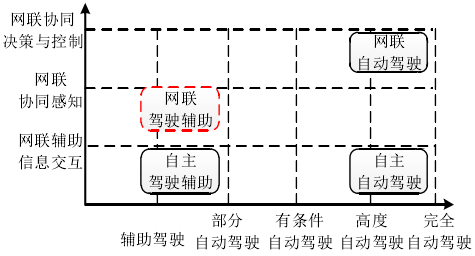 近年来,随着控制技术与车间通信技术的快速发展,智能网联汽车的概念被提出。如图1.2所示,国家制造强国建设战略咨询委员会发布的《节能与新能源技术路线图》将智能网联技术按照智能化程度划分为5级,按照网联化程度划分为3级,智能网联汽车的最终目标时实现网联自动驾驶。