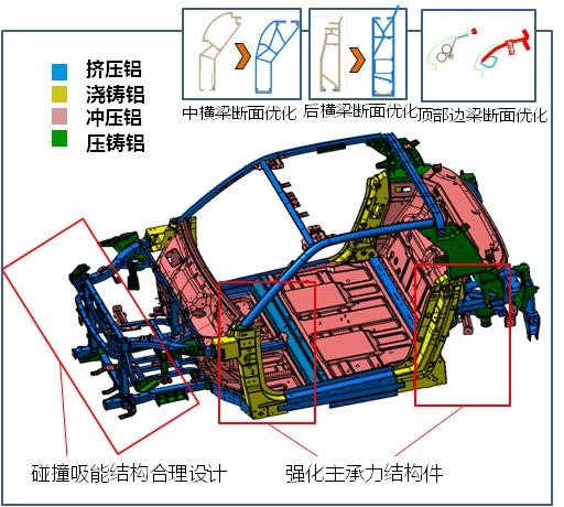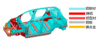 Lite车身平台采用铝合金“框架式”结构(如图10)和模块化设计理念,如前端总成、驾驶舱总成、后端总成、顶盖骨架总成5个模块,集成应用了挤压铝(53%)、冲压铝(17%)、压铸铝(11%)、浇铸铝(19%)等多种类型的铝合金材料,仅车身(含风挡玻璃、覆盖件及开闭件)较传统同级别车型车身减重30-33%。