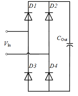 电动汽车无线充电系统中的高频整流桥通常采用全桥不控整流结构,其主要由四个二极管及一个滤波电容组成。它的作用是将副边接收线圈感应的交流电转化为直流电,经电容滤波后为电池供电。高频整流桥的电路如图7所示。