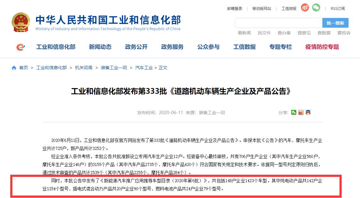 2020年6月11日,工业和信息化部公告了《道路机动车辆生产企业及产品(第333批)》,依据同一型号判定原则归纳后,通过技术审查的新能源汽车产品共计198个。