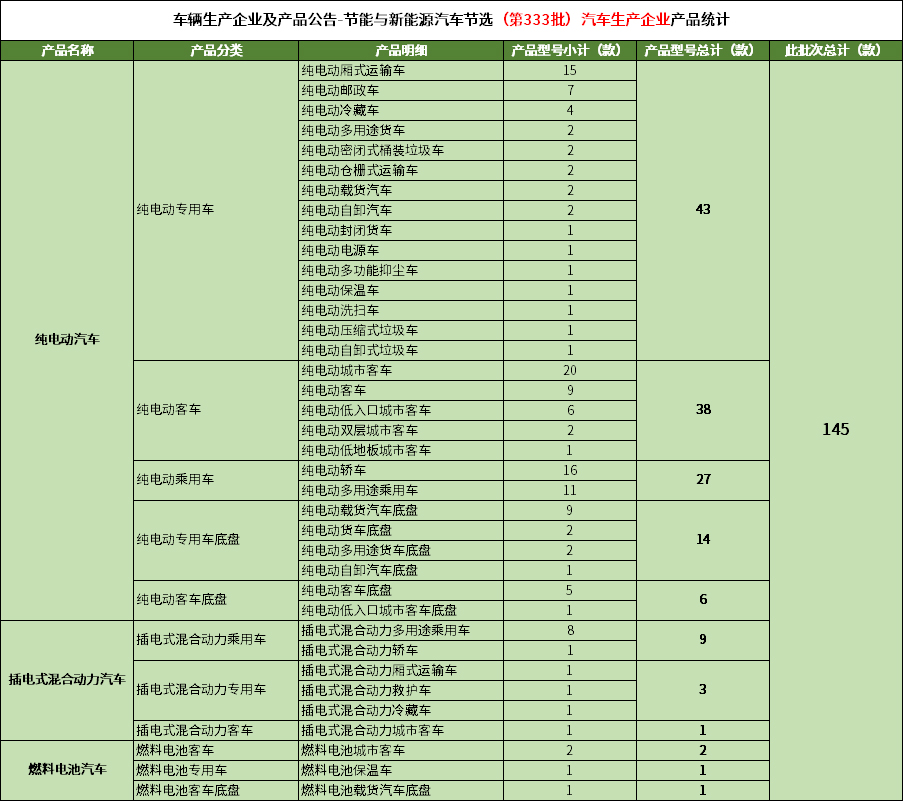 共计67个生产厂家、67个品牌、145个型号进入第333批节能与新能源汽车节选范畴,汽车生产企业新产品类型明细如下表所示。