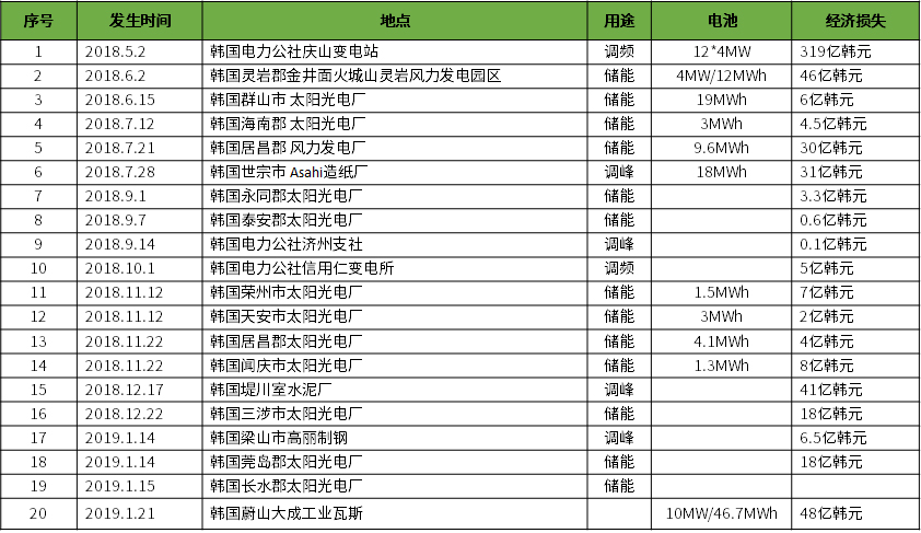 考虑到电池种类未知的事故车主要为乘用车,这部分电池极有可能为三元电池。由此可见,三元电池引发的安全事故占绝对主体。事实上,除电动车外,三元电池引起的储能电站起火事故也屡见不鲜。据不完全统计,从2018年至今,韩国共发生储能电站起火事件超20起(见表1)。