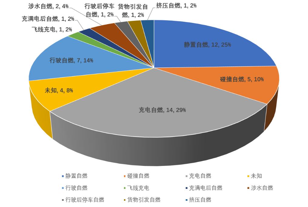 根据公开资料统计,我国境内仅在2018年就发生了40余起电动汽车起火事故。同期,类似事故在国外也发生多起。鉴于电动车起火可能与电器线路、机械损伤和外部火源等密切相关,且重要证据会在燃烧过程中消失,因此原因分析往往异常困难和复杂。但根据事故前电动车所处状态和所用电池种类,我们还是可以发现一些规律性的信息。