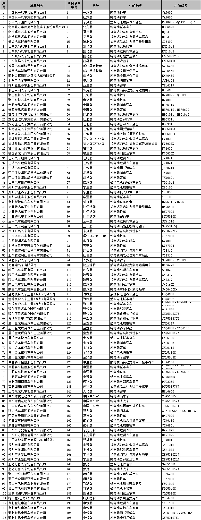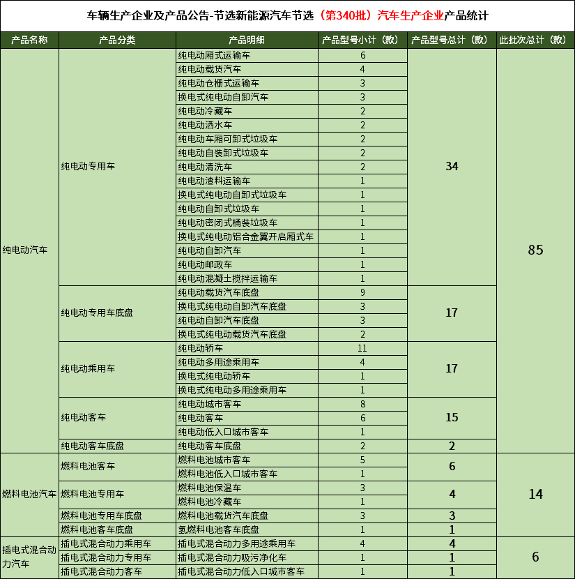 2、燃料种类:本批次纯电动产品共计120款(含乘用车17款、客车18款、专用车66款、客车底盘2款、专用车底盘17款);插电式混合动力产品共计7款(含乘用车4款、客车1款、专用车2款);燃料电池产品16款(含客车6款、专用车6款、客车底盘1款、专用车底盘3款)。