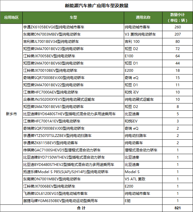 2016年新乡市共推广各类新能源汽车821辆(不含长垣县、不含非插电式混合动气汽车),其中:纯电动公交车260辆、企业用纯电动客车3辆、纯电动环卫车2辆、纯电动厢式货车10辆、纯电动乘用车538辆、插电式(含增程式)混合动力乘用车8辆。