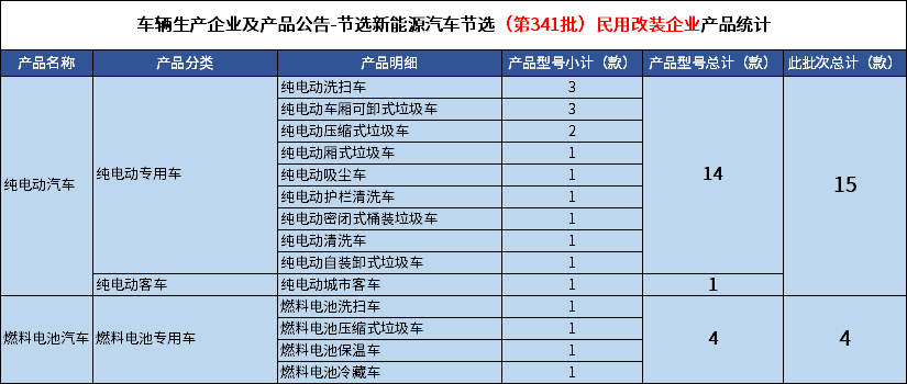 共计18个生产厂家、18个品牌、19个型号进入第341批节能与新能源汽车节选范畴,民用改装车生产企业新产品类型明细如下表所示。