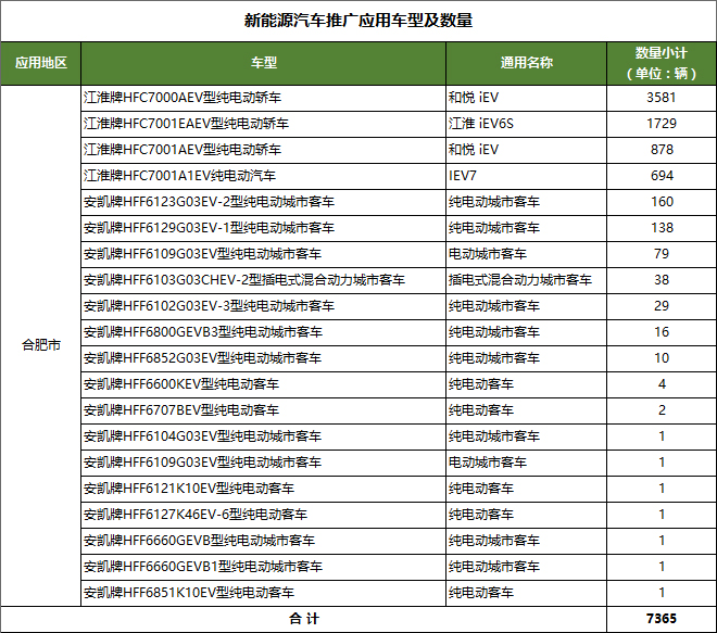 2016年1~12月底合肥市新能源汽车推广应用车型及数量统计如下: