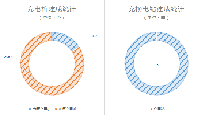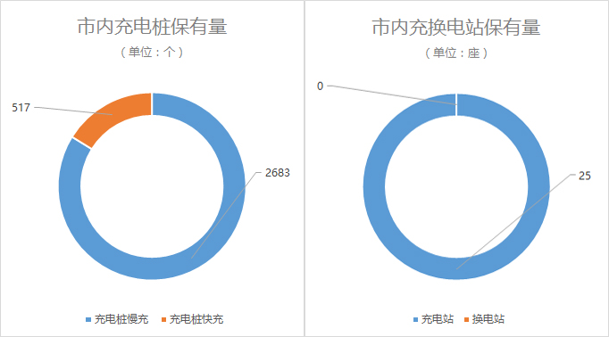 按充电桩种类来分,其中公共充电桩有894个,专用充电桩2306个;直流充电桩517个,交流充电桩2683。