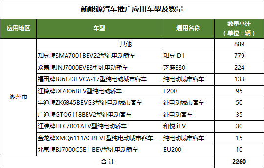 2016年1~12月底湖州市新能源汽车推广应用车型及数量统计如下: