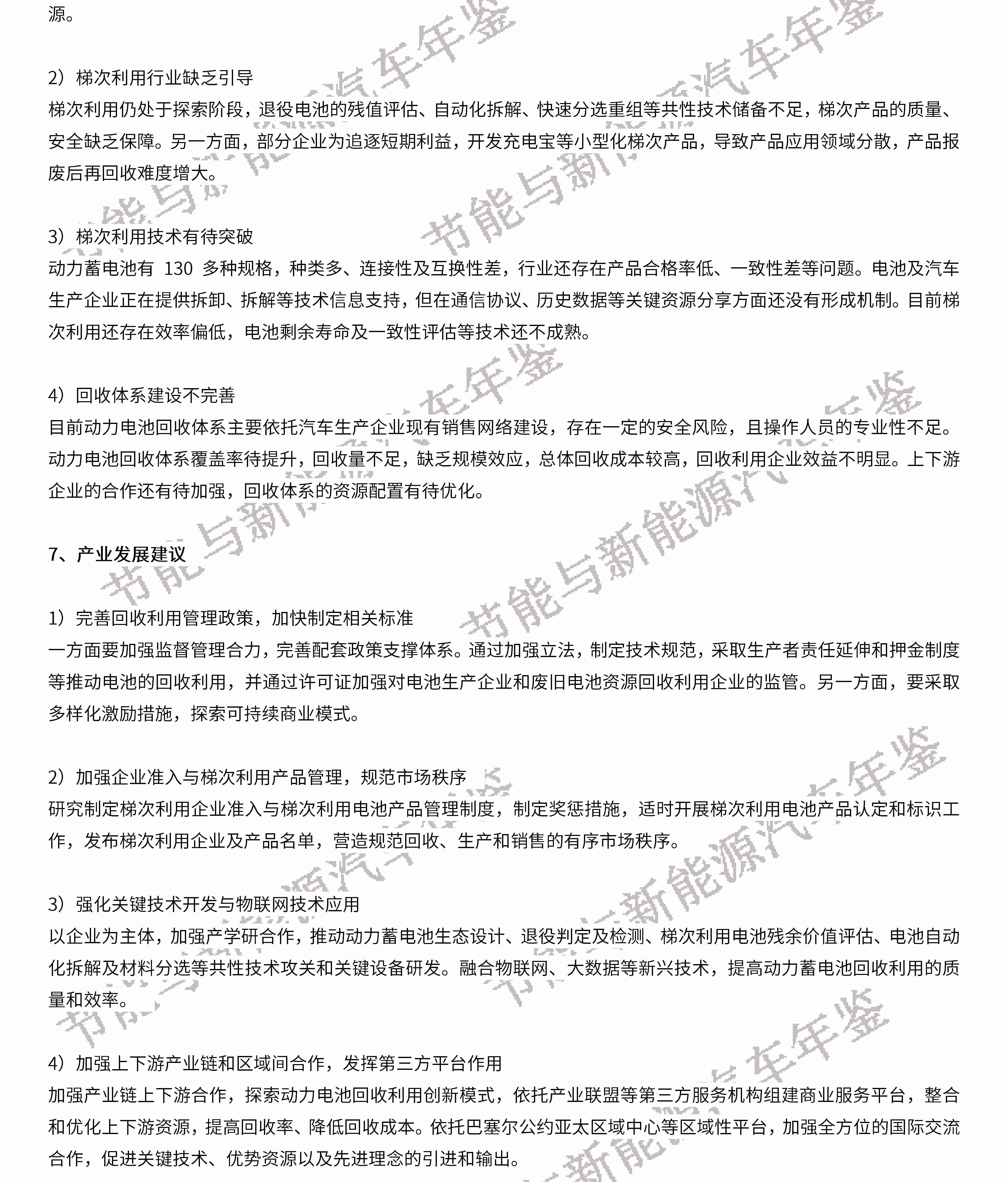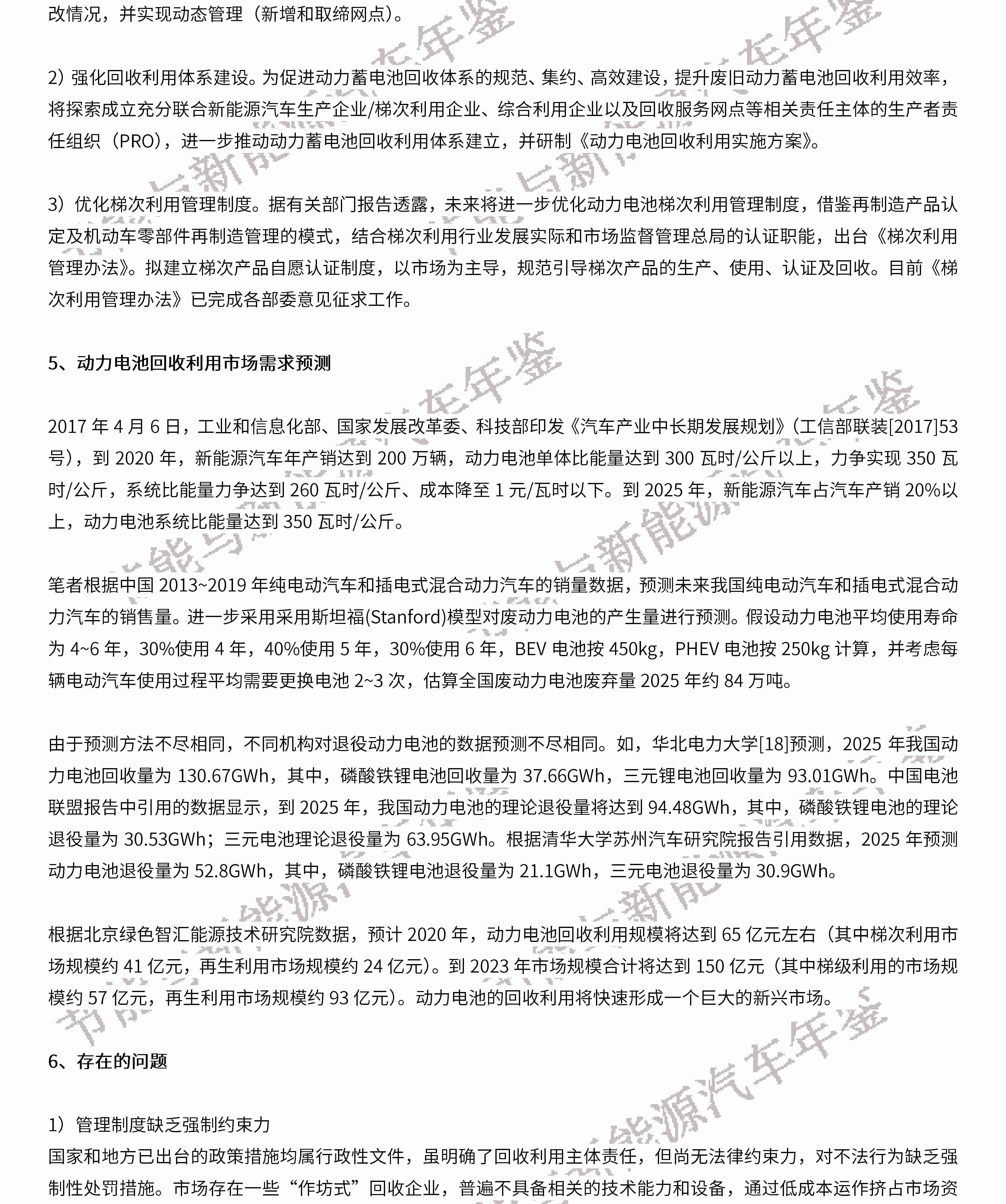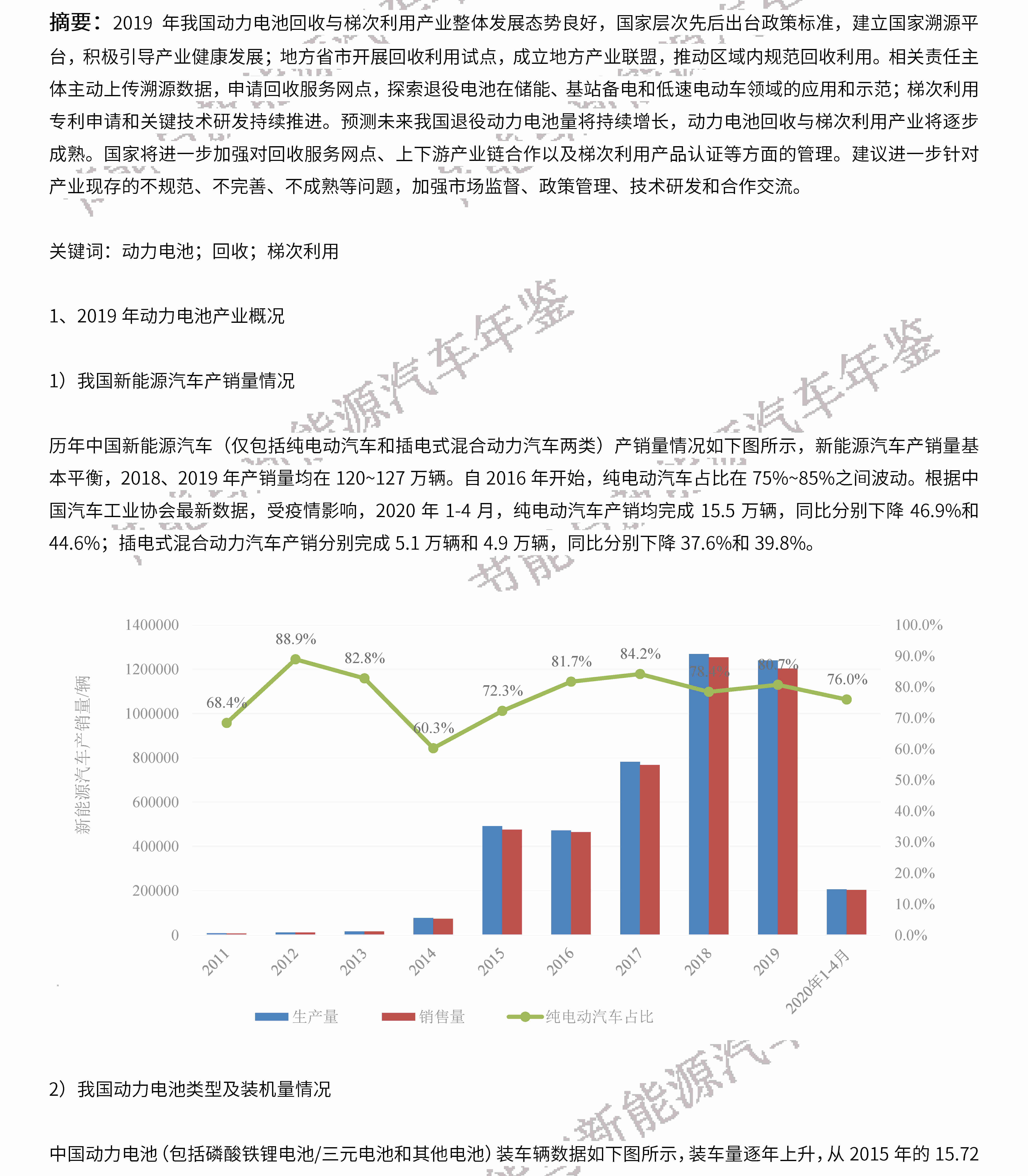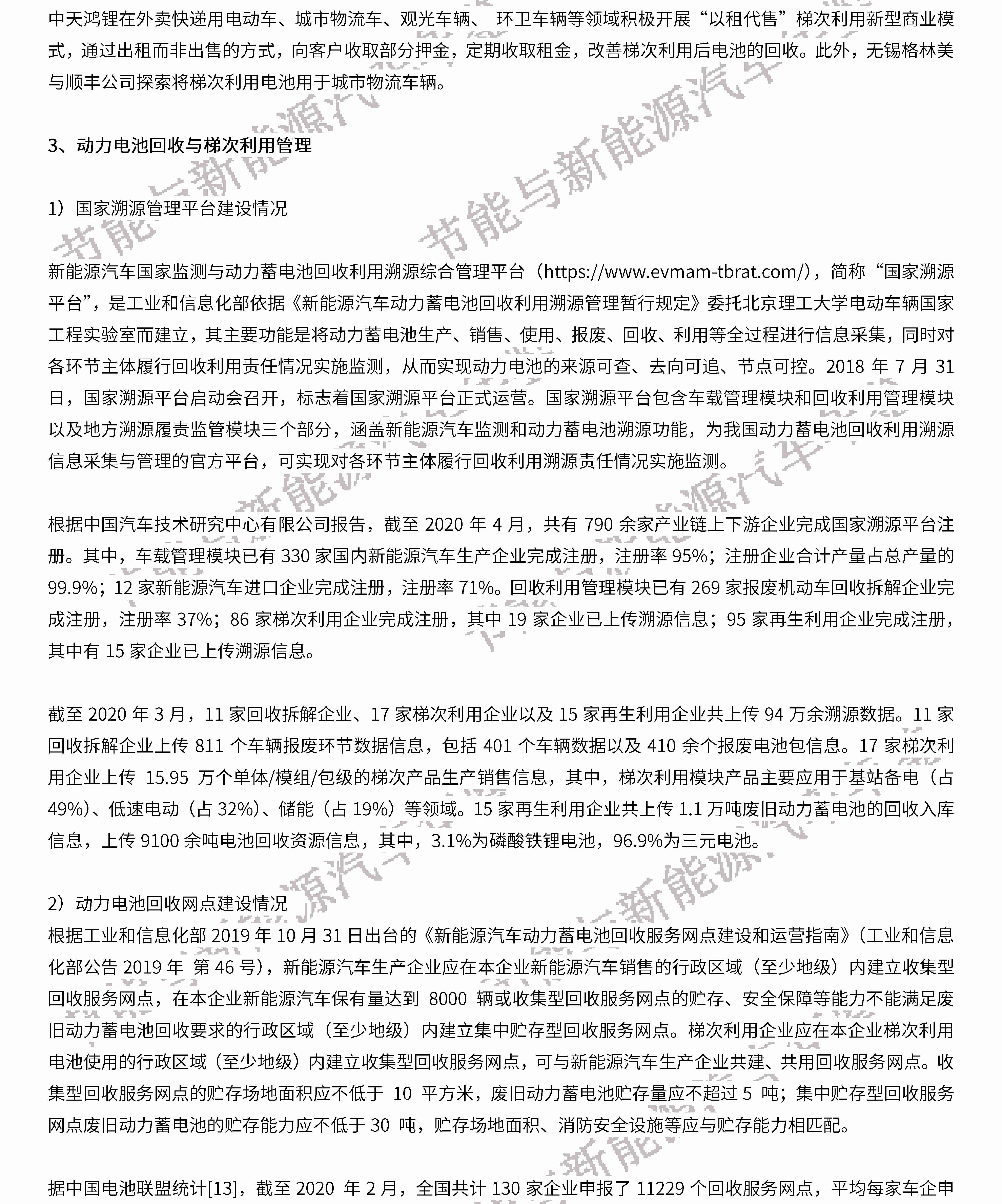 摘要:2019年我国动力电池回收与梯次利用产业整体发展态势良好,国家层次先后出台政策标准,建立国家溯源平台,积极引导产业健康发展;地方省市开展回收利用试点,成立地方产业联盟,推动区域内规范回收利用。相关责任主体主动上传溯源数据,申请回收服务网点,探索退役电池在储能、基站备电和低速电动车领域的应用和示范;梯次利用专利申请和关键技术研发持续推进。预测未来我国退役动力电池量将持续增长,动力电池回收与梯次利用产业将逐步成熟。国家将进一步加强对回收服务网点、上下游产业链合作以及梯次利用产品认证等方面的管理。建议进一步针对产业现存的不规范、不完善、不成熟等问题,加强市场监督、政策管理、技术研发和合作交流。