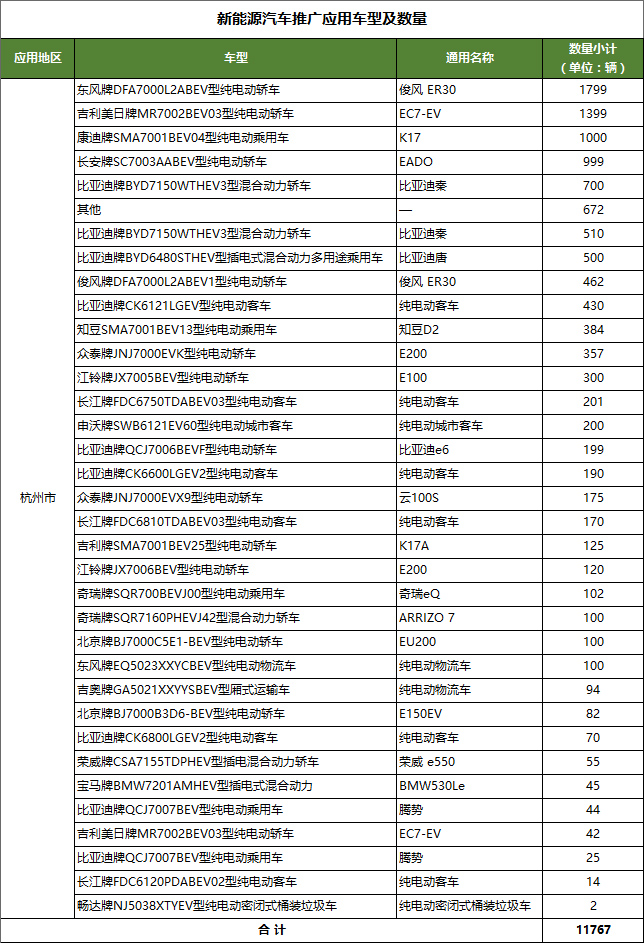 2016年1~12月底杭州市新能源汽车推广应用车型及数量统计如下: