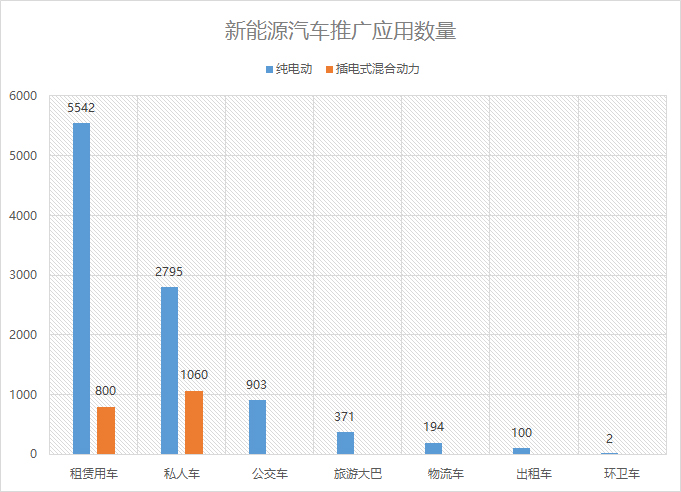 2016年,杭州市新增新能源汽车11767辆,折合标准车25884辆。其中:纯电动公交车903辆,环卫车2辆,企业通勤、租赁中巴车41辆,纯电动物流车194辆,租赁新能源汽车5934辆,个人购买3855辆,峰会保障用车及其他838辆。