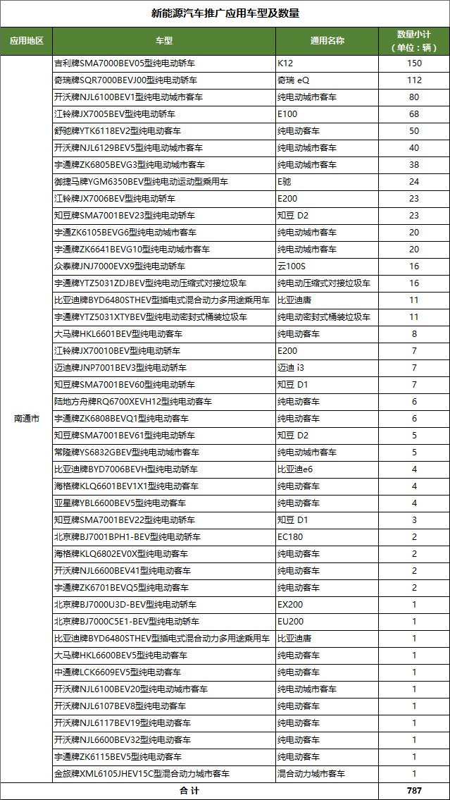 2016年1~12月底南通市新能源汽车推广应用车型及数量统计如下: