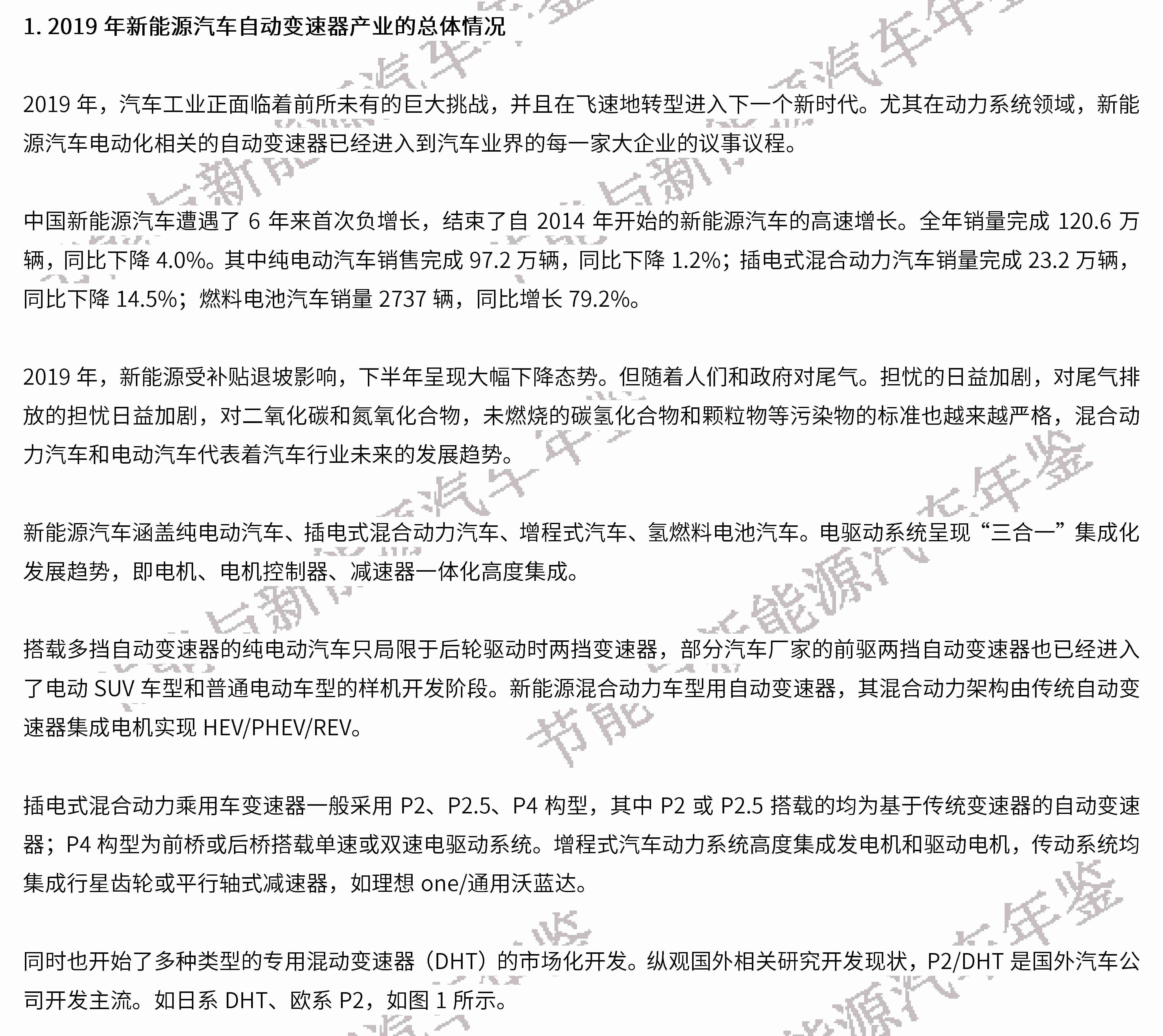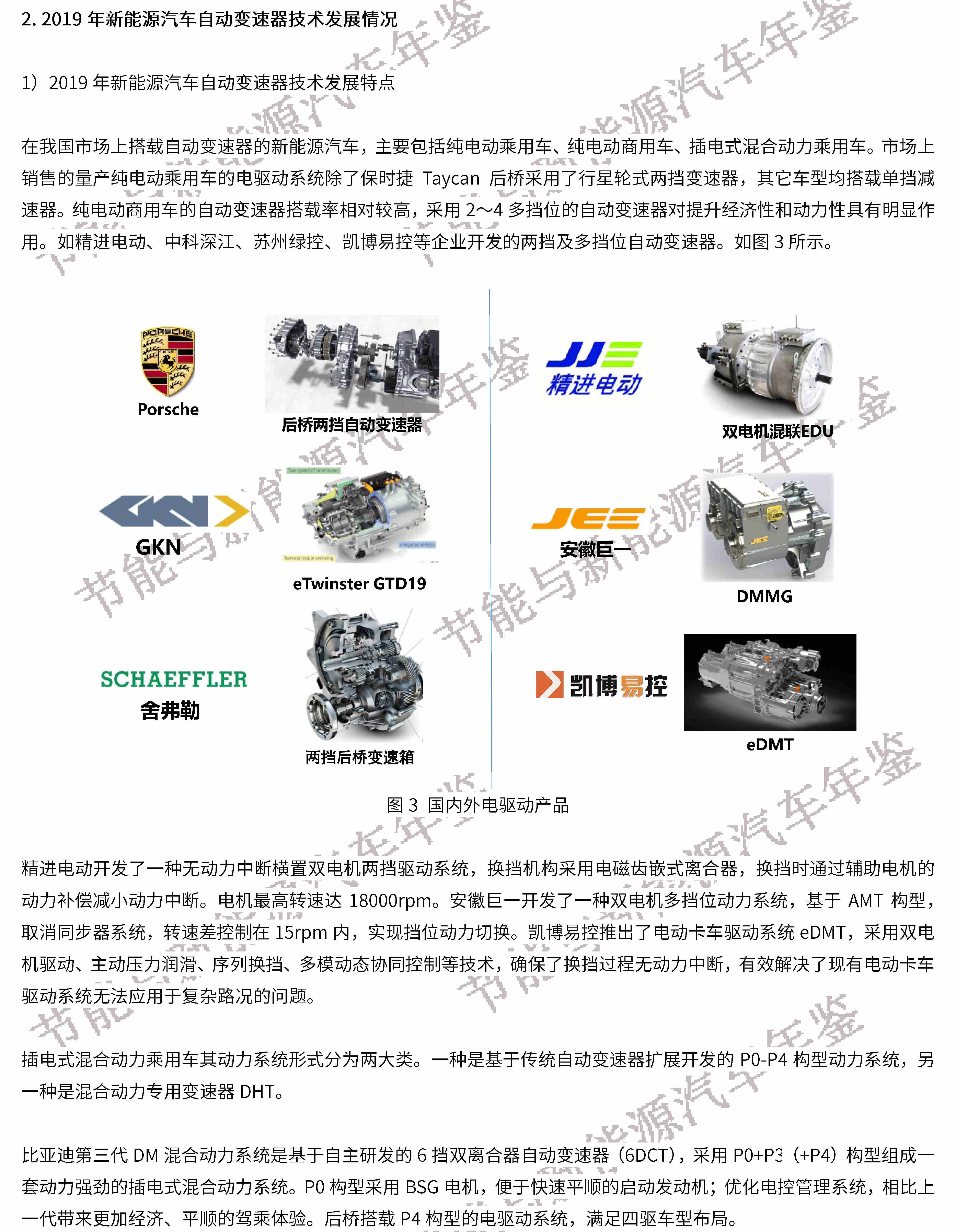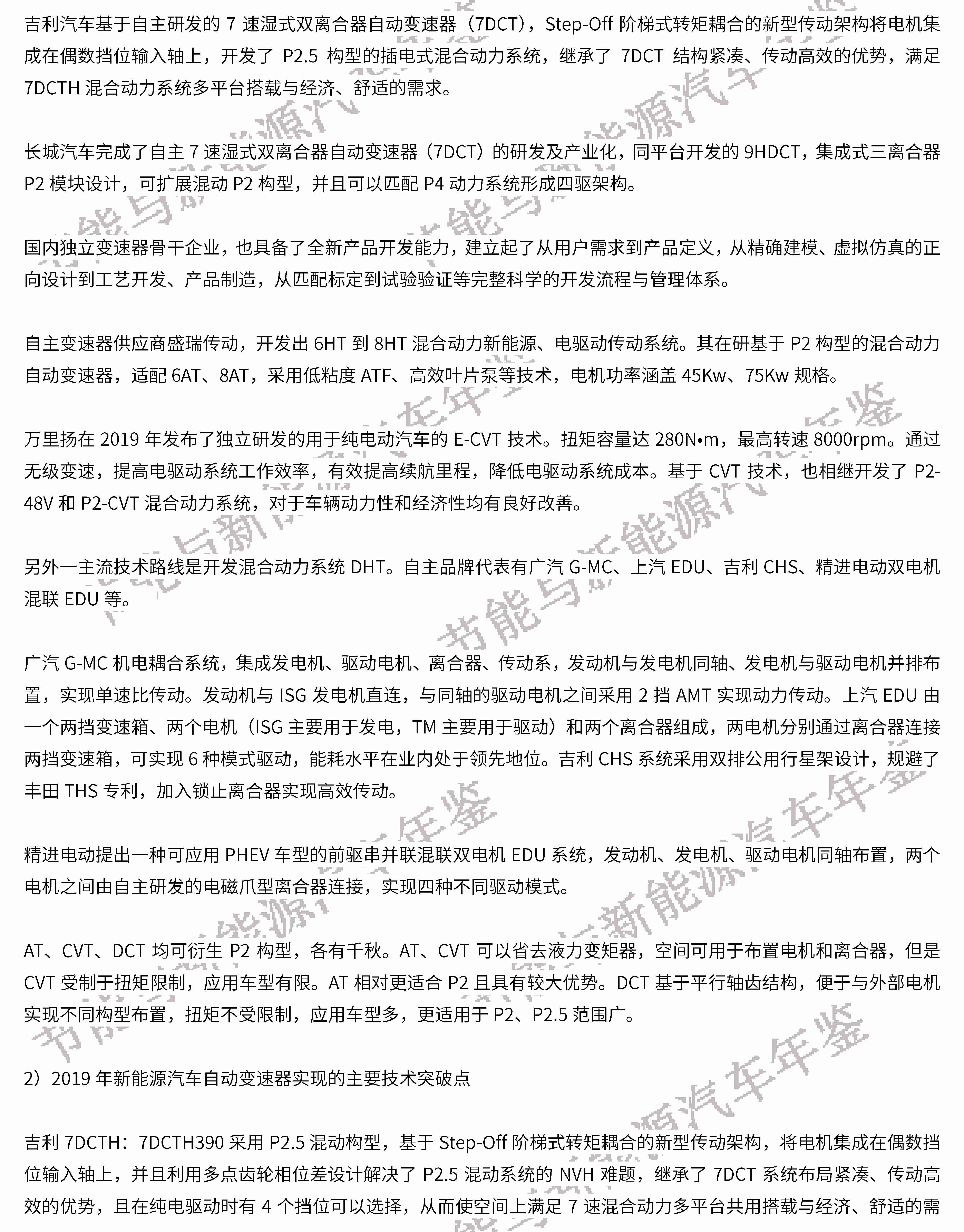 搭载多挡自动变速器的纯电动汽车只局限于后轮驱动时两挡变速器,部分汽车厂家的前驱两挡自动变速器也已经进入了电动SUV车型和普通电动车型的样机开发阶段。新能源混合动力车型用自动变速器,其混合动力架构由传统自动变速器集成电机实现HEV/PHEV/REV。