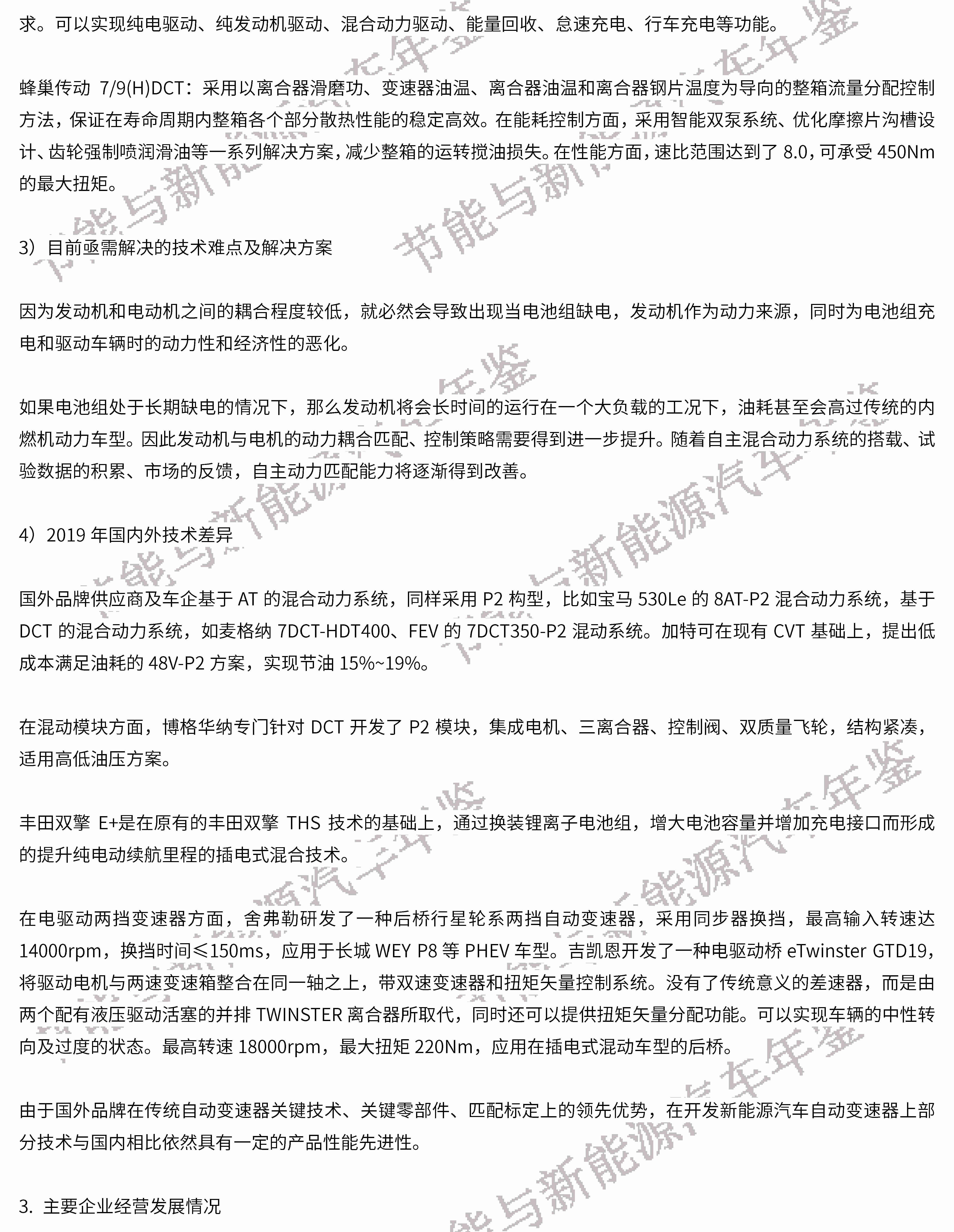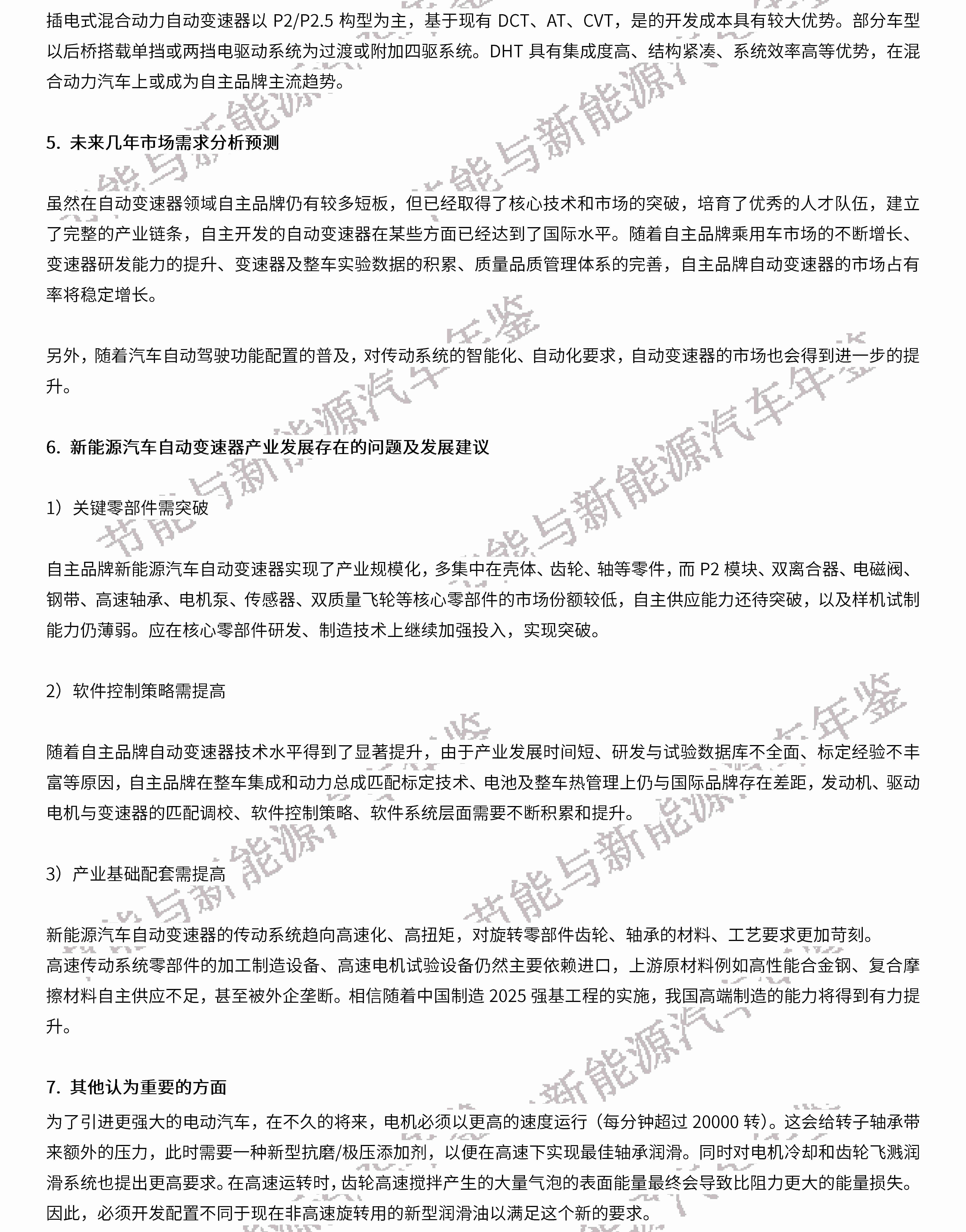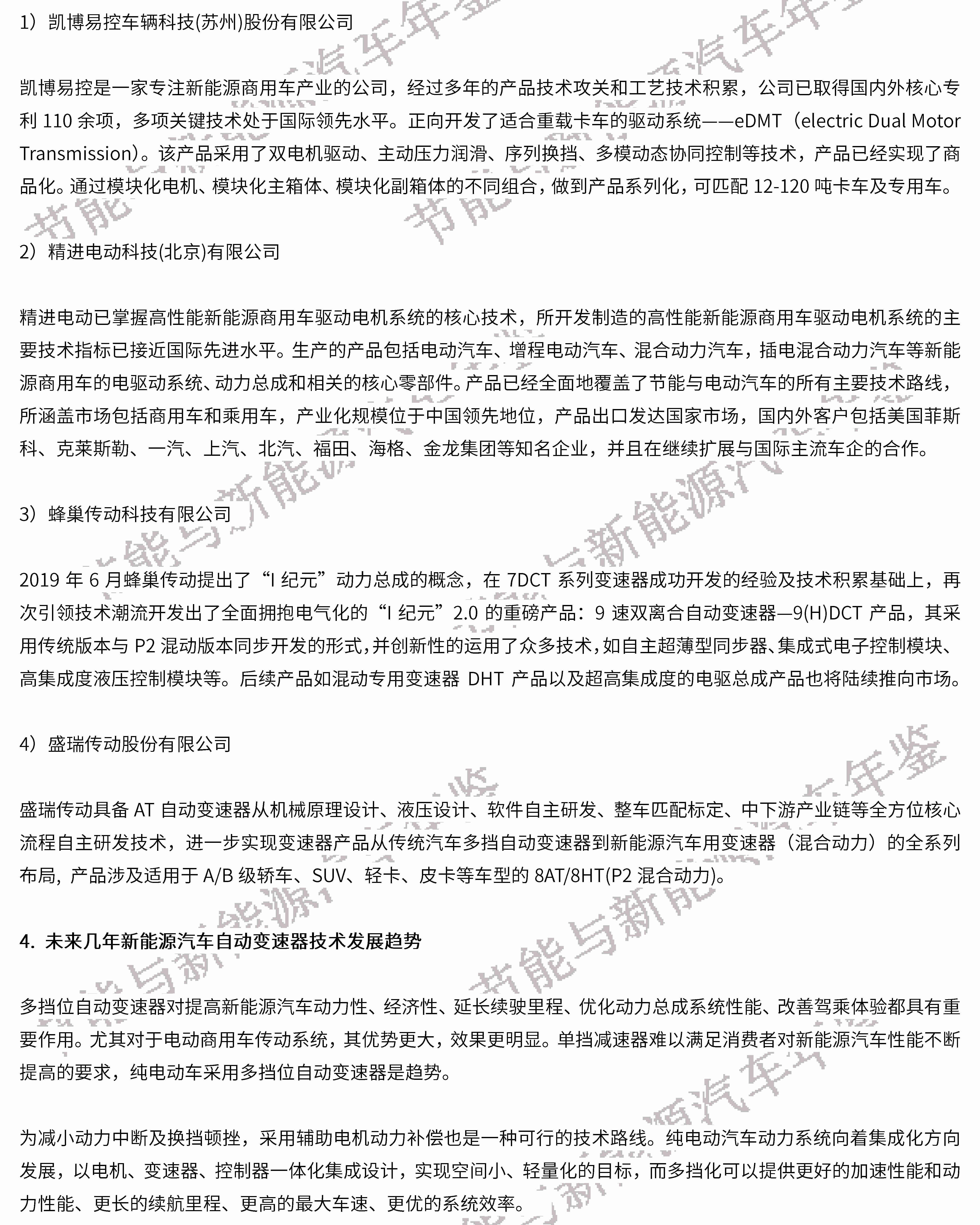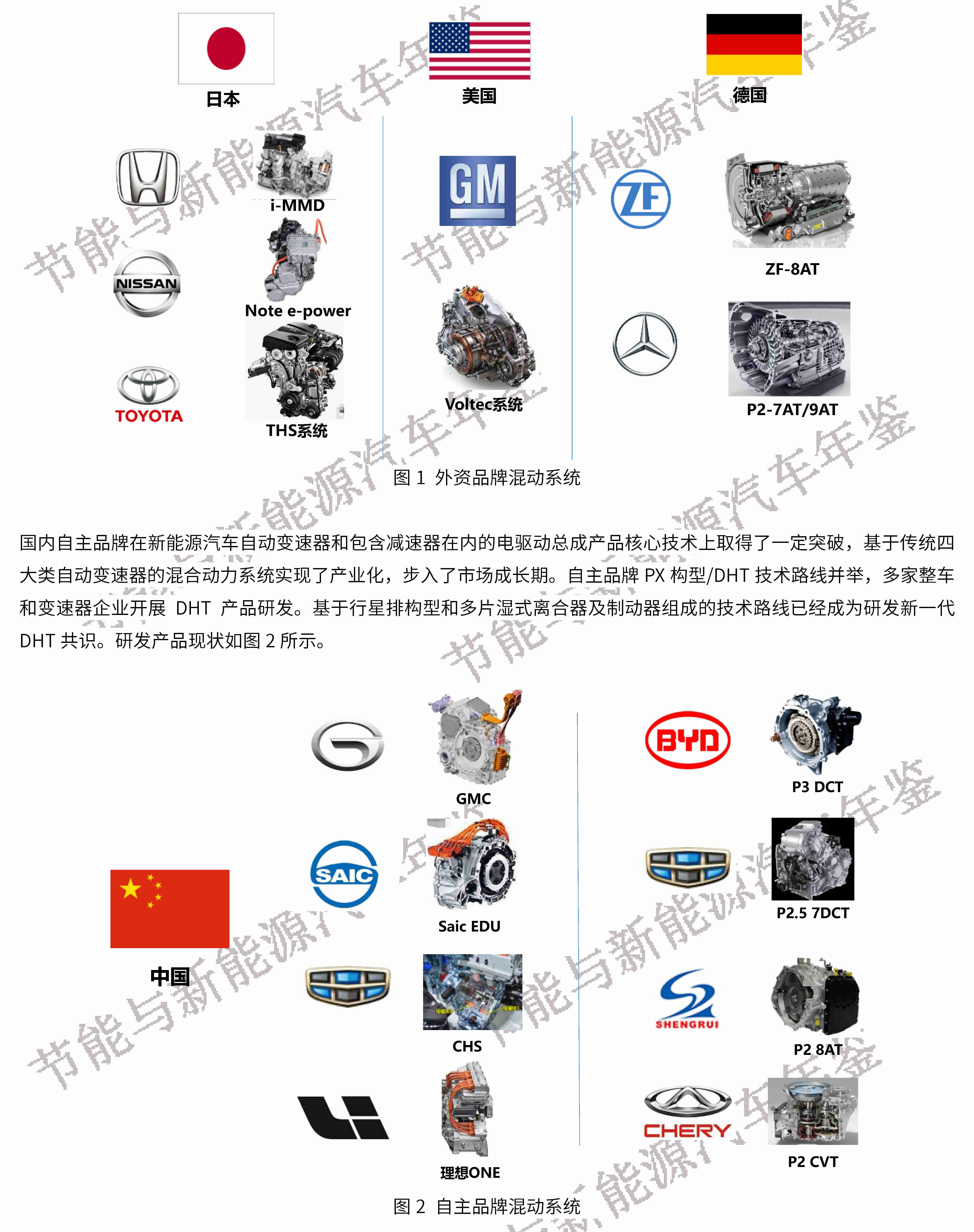 搭载多挡自动变速器的纯电动汽车只局限于后轮驱动时两挡变速器,部分汽车厂家的前驱两挡自动变速器也已经进入了电动SUV车型和普通电动车型的样机开发阶段。新能源混合动力车型用自动变速器,其混合动力架构由传统自动变速器集成电机实现HEV/PHEV/REV。