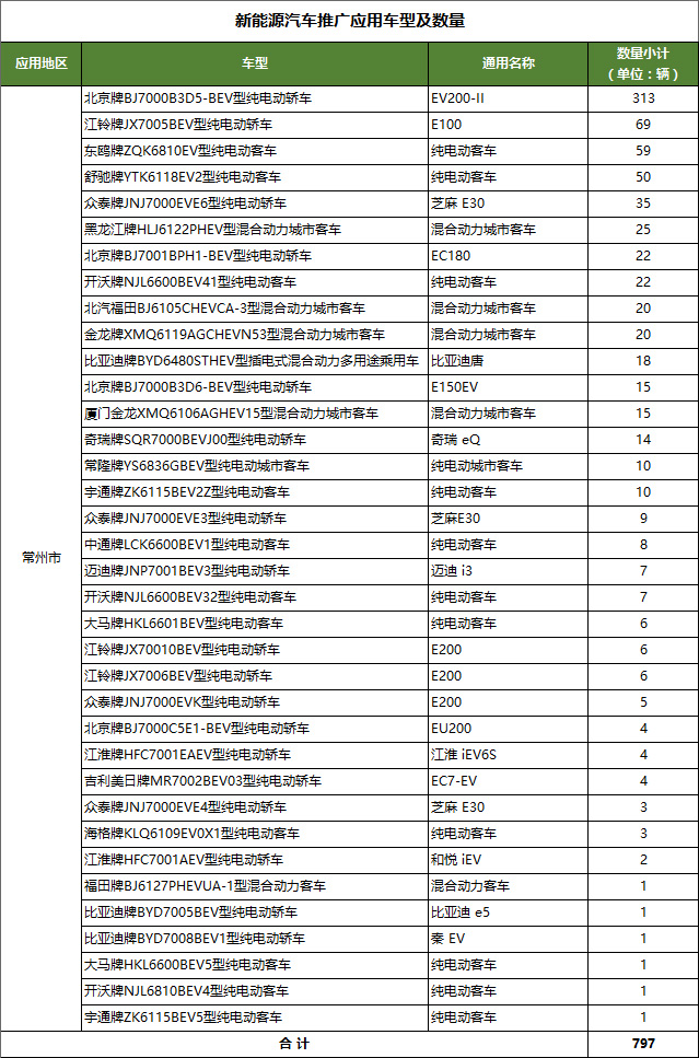 2016年1~12月底常州市新能源汽车推广应用车型及数量统计如下: