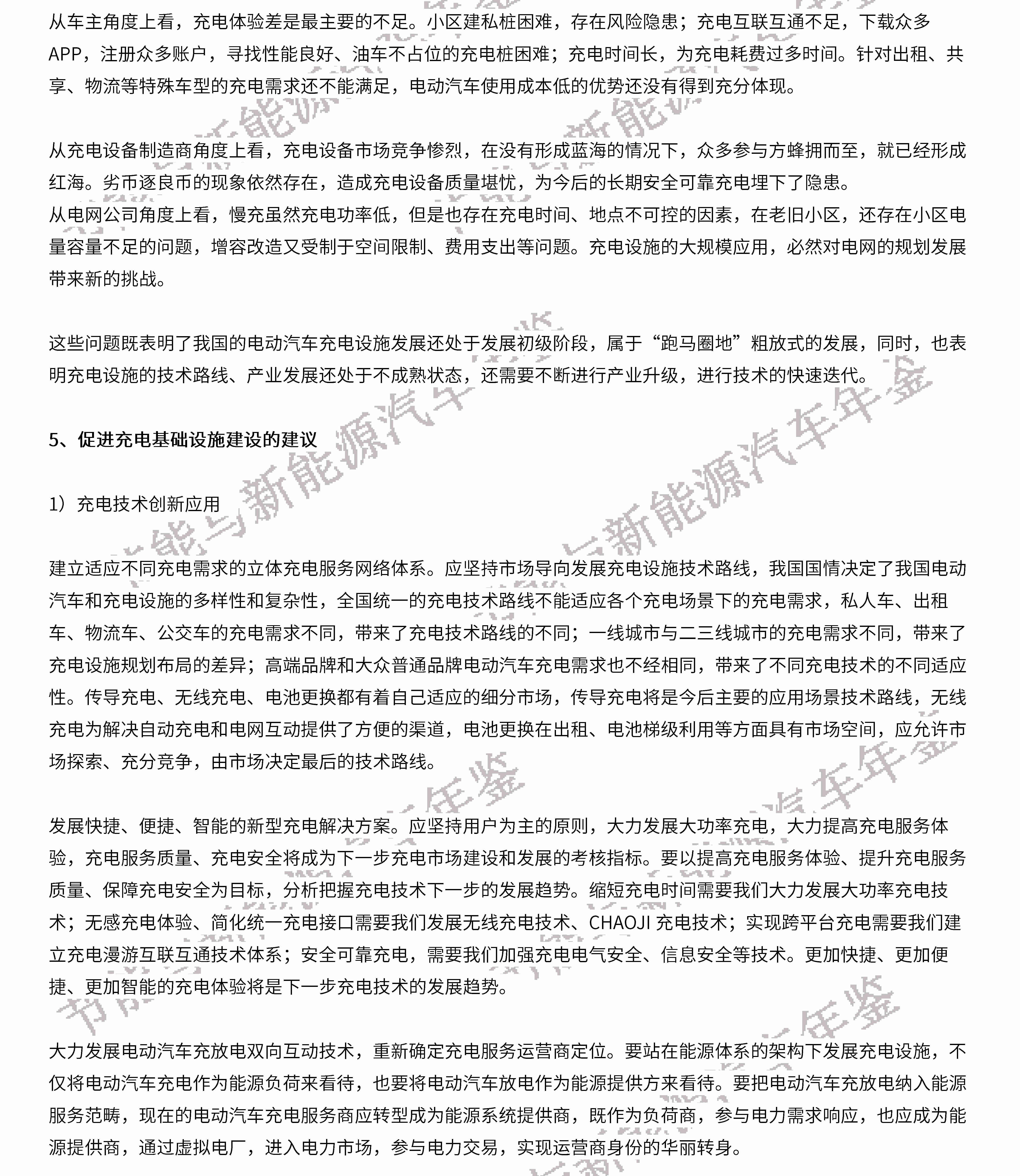 发展快捷、便捷、智能的新型充电解决方案。应坚持用户为主的原则,大力发展大功率充电,大力提高充电服务体验,充电服务质量、充电安全将成为下一步充电市场建设和发展的考核指标。要以提高充电服务体验、提升充电服务质量、保障充电安全为目标,分析把握充电技术下一步的发展趋势。缩短充电时间需要我们大力发展大功率充电技术;无感充电体验、简化统一充电接口需要我们发展无线充电技术、CHAOJI充电技术;实现跨平台充电需要我们建立充电漫游互联互通技术体系;安全可靠充电,需要我们加强充电电气安全、信息安全等技术。更加快捷、更加便捷、更加智能的充电体验将是下一步充电技术的发展趋势。