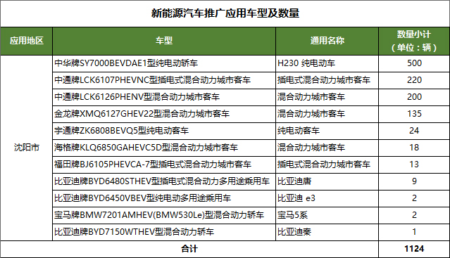 2016年1~12月底沈阳市新能源汽车推广应用车型及数量统计如下: