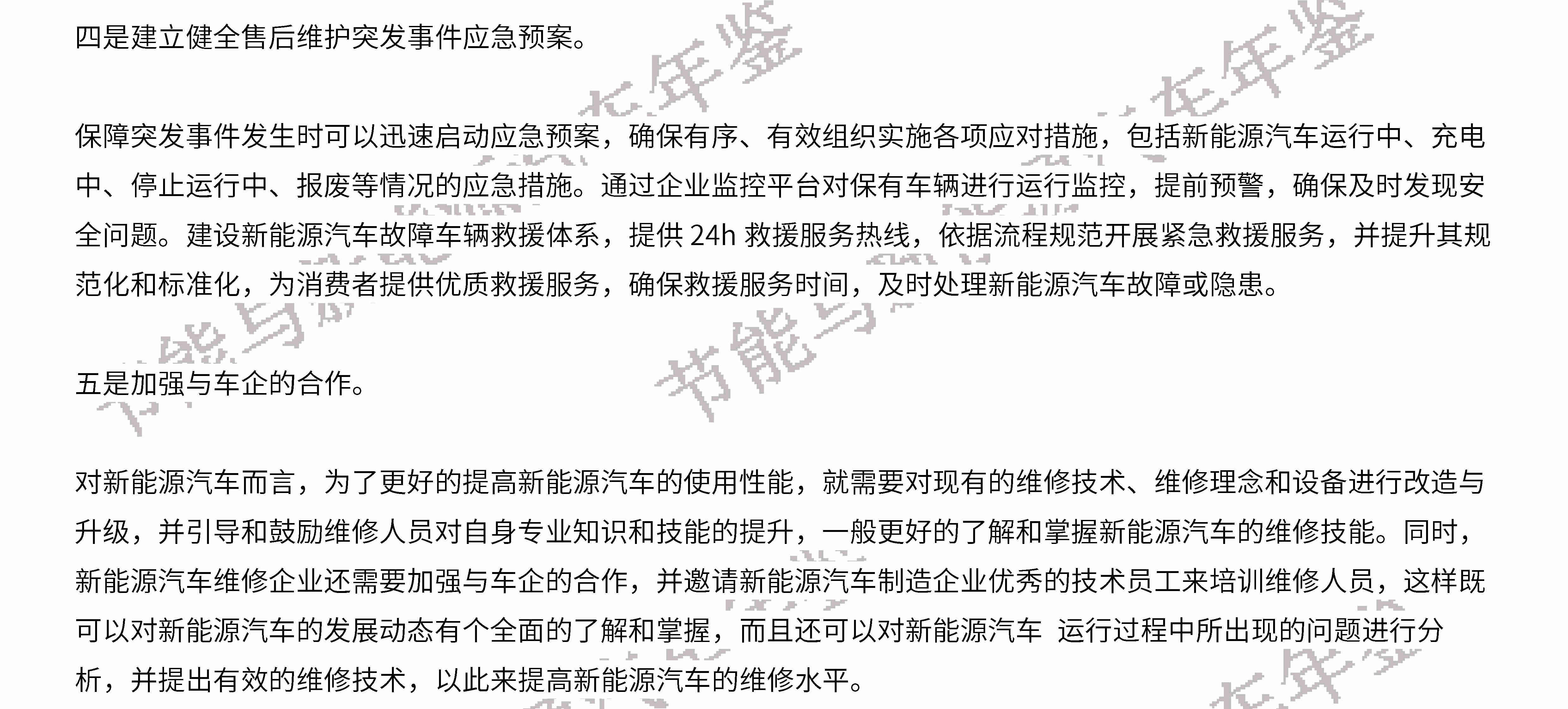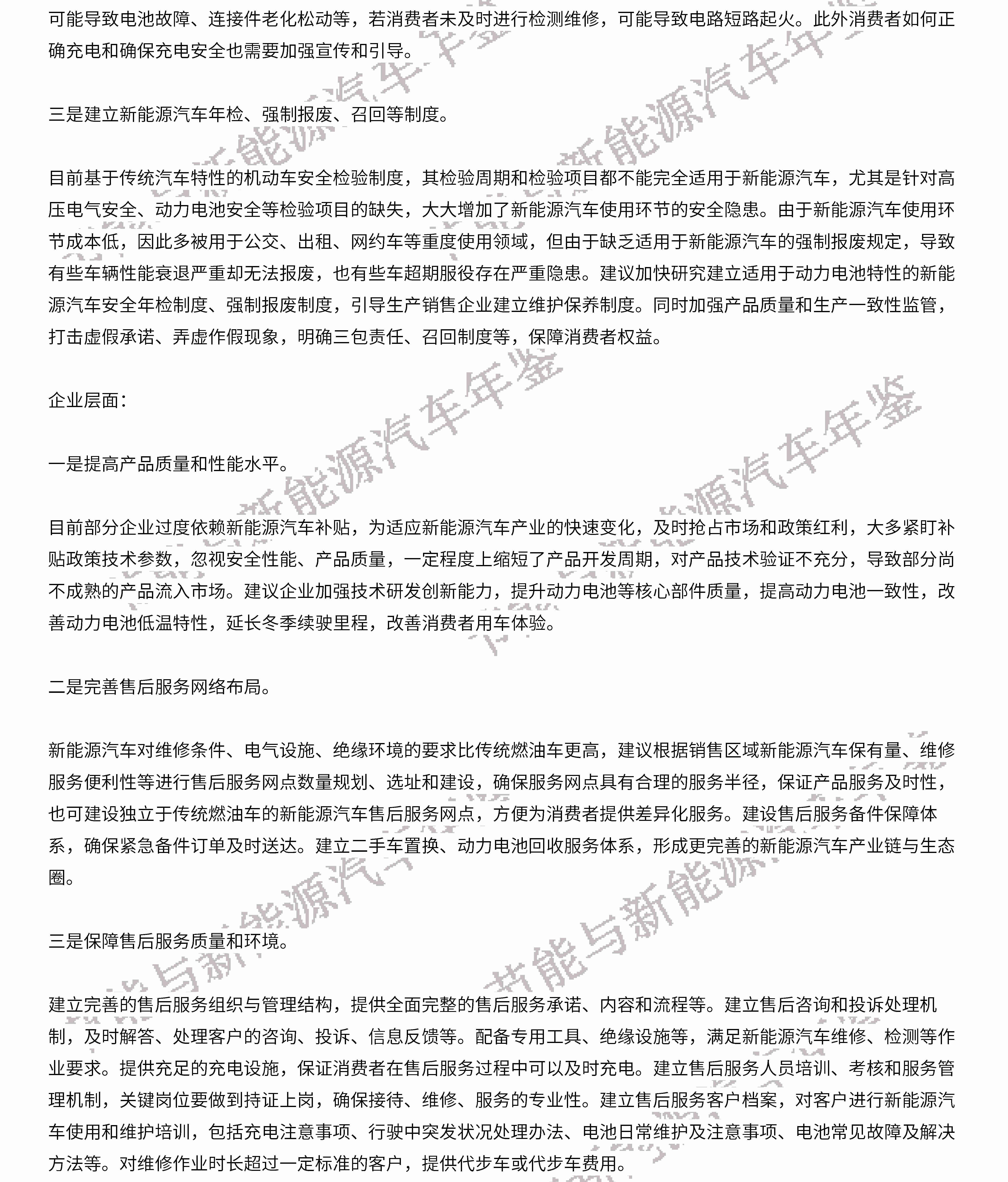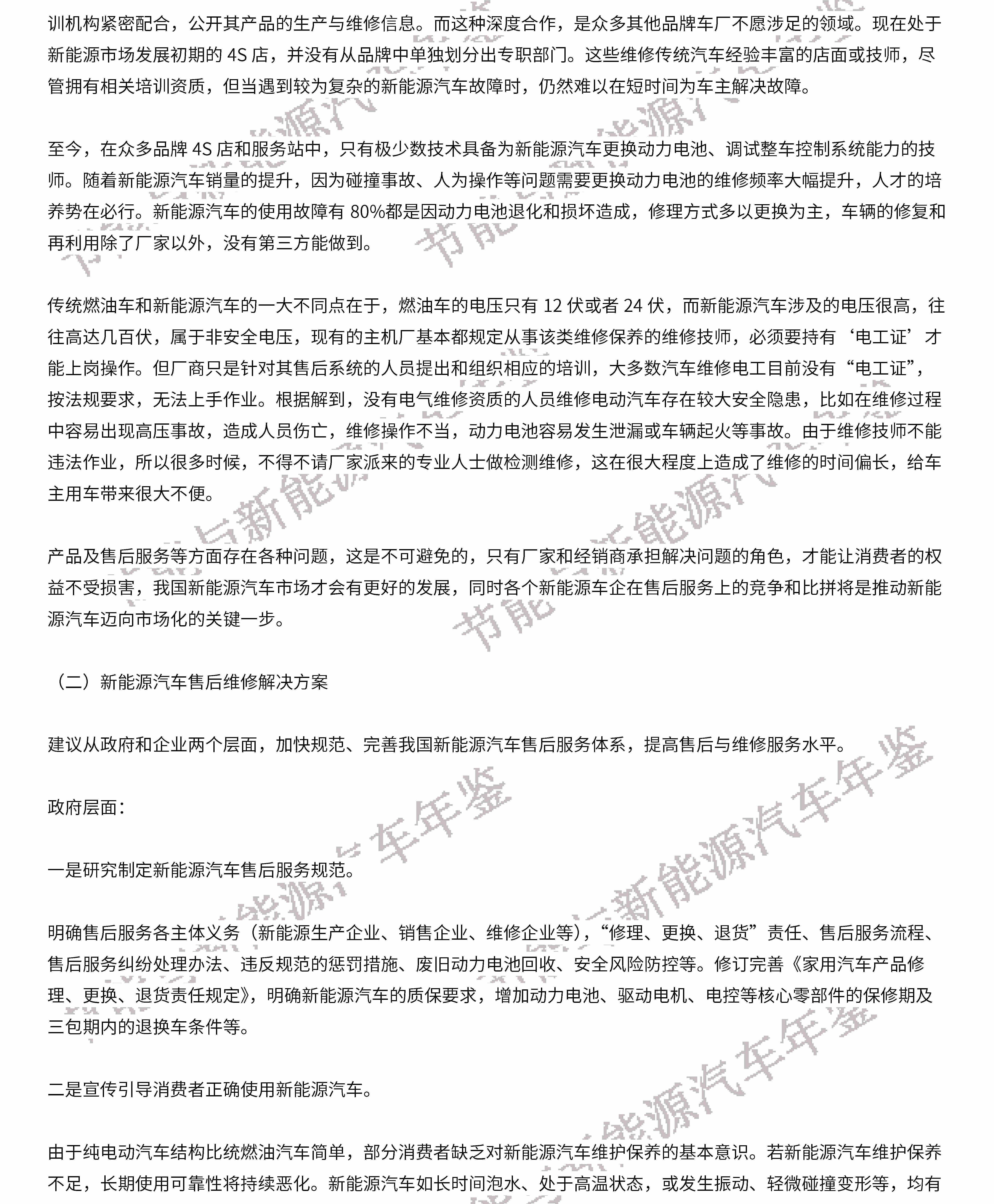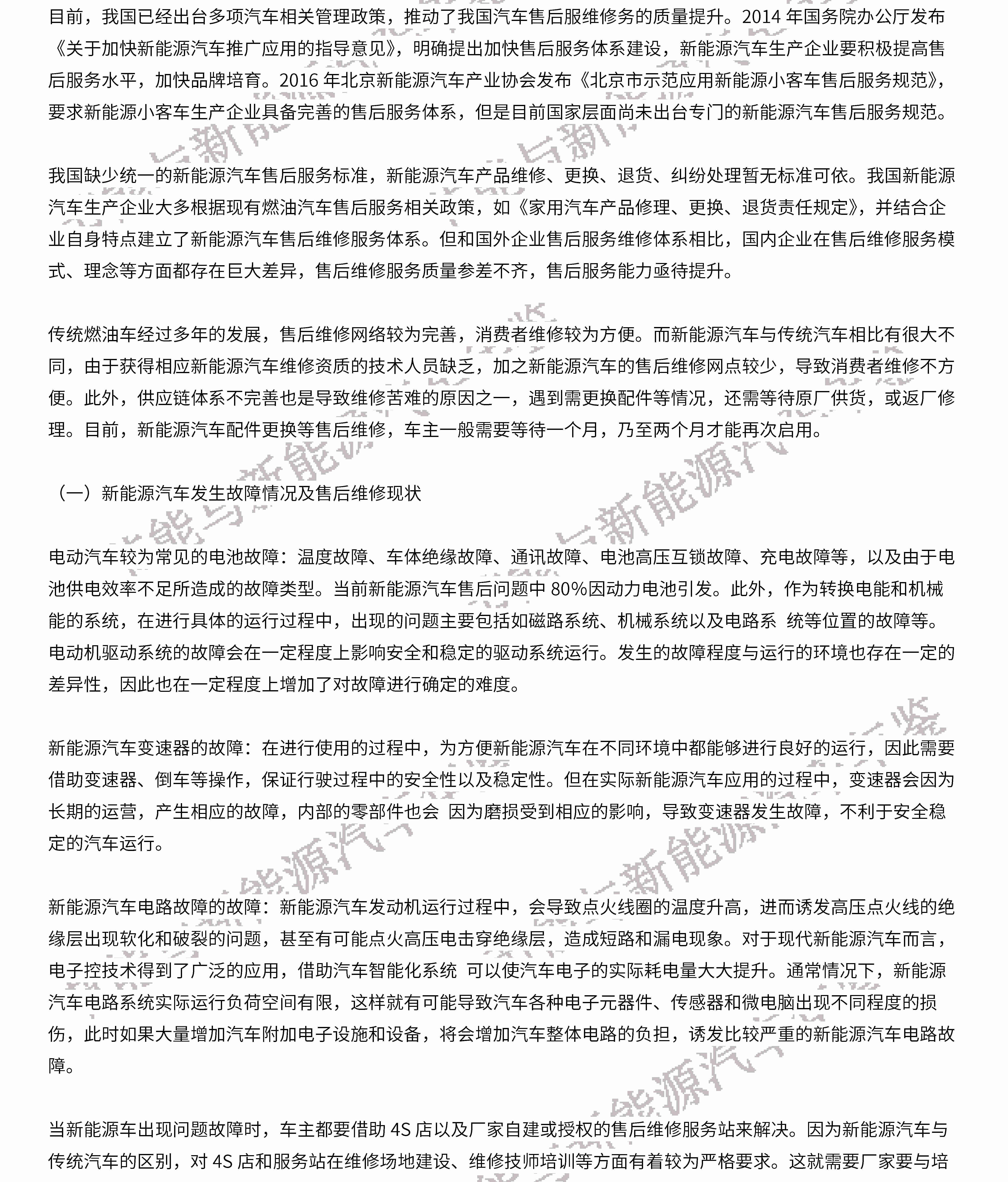 我国缺少统一的新能源汽车售后服务标准,新能源汽车产品维修、更换、退货、纠纷处理暂无标准可依。我国新能源汽车生产企业大多根据现有燃油汽车售后服务相关政策,如《家用汽车产品修理、更换、退货责任规定》,并结合企业自身特点建立了新能源汽车售后维修服务体系。但和国外企业售后服务维修体系相比,国内企业在售后维修服务模式、理念等方面都存在巨大差异,售后维修服务质量参差不齐,售后服务能力亟待提升。