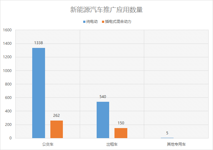 按动力类型分:纯电动客车1338辆、纯电动乘用车540辆、纯电动专用车5辆、插电式混合动力客车262辆、插电式混合动力乘用车150辆;