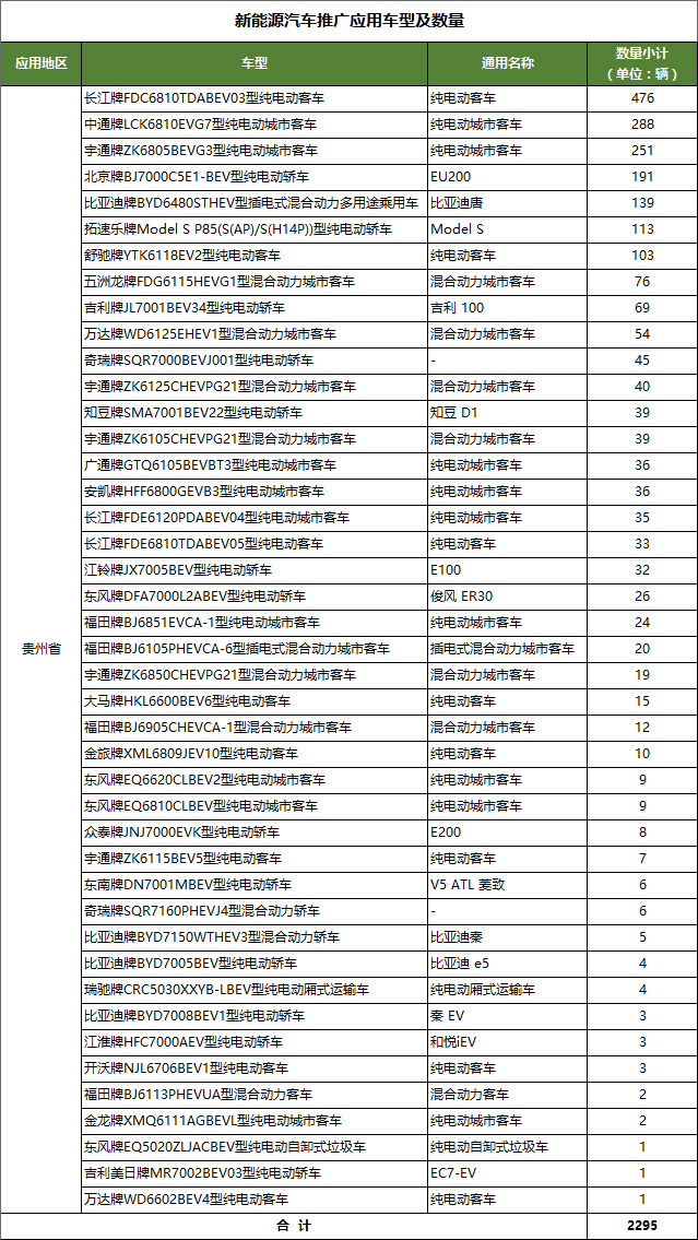 2016年1~12月底贵州省电动汽车推广应用车型及数量统计如下:
