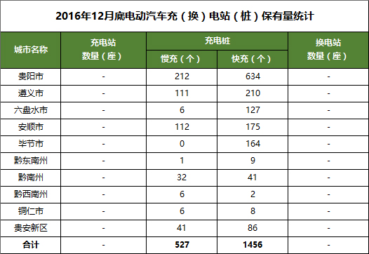 截止12月底,贵州省电动汽车充(换)电站(桩)保有量详见下表。
